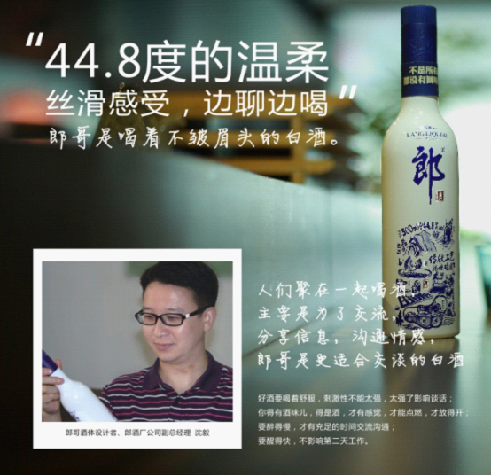 郎哥44.8度酒体为酱香白酒首创。郎哥的酒体度数设置为44.8度,这样在降低度数的同时维持了酒体的平衡性。在保留酱香白酒的优雅和芳香时,也降低了刺激性,让口感更舒适。郎酒厂公司副总经理、国家级品酒大师沈毅介绍说:“中度酒符合现代人们对白酒喝着舒服、醉得慢、易醒酒的新要求,同时也是消费文明下消费者理性选择的趋势。”