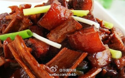 #微美食#啤酒焖笋干五花肉,家常菜。五花肉切方块,油锅炒五花肉,炒出油,微微变黄时,放入葱花和姜丝、八角和花椒翻炒出香味;加笋干、老抽上色,翻炒均匀,加啤酒和冰糖,啤酒没过五花肉的表面,大火煮开后转小火焖炖收汁,洒葱段即可。笋干入味有嚼头,五花肉肥而不腻,散发淡淡酒香,十分下饭。