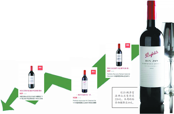 北京商报记者登录1号店查看奔富全系列葡萄酒,过去1瓶奔富洛神山庄售价是228元,本周的标价却骤降至59元,相当于10.6澳元,考虑到运输成本以及中国对葡萄酒所征收的48%关税,不比澳洲本地的售价高多少。较为高端的奔富Bin407,过去1瓶标价1380元,但现在1号店的标价为380元,和澳洲售价也相差无几。