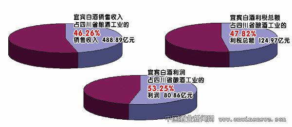 “十一五”期末,四川宜宾白酒生产企业发展到284家,其中规模以上企业达到28家,全市规模以上酒类企业完成酒类产量34.29万千升,销售收入达到488.89亿元,白酒规模以上企业利税总额实现124.97亿元,利润实现80.86亿元,分别比2007年增长138.35%、83.35%、124.77%和147.32%。宜宾白酒的销售收入、利税总额、利润分别占四川省酿酒工业的46.26%、47.82%和53.25%,比2007年实现了产量、销售收入、利税三个翻番。其中,宜宾白酒产值已达到四川省酿酒工业的50%、全国酿酒工业的20%。