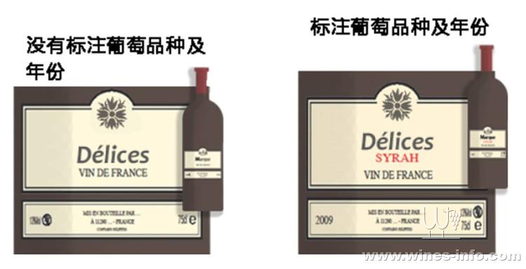 “法国葡萄酒 VIN DE FRANCE ”等级包括了红葡萄酒,白葡萄酒和桃红葡萄酒。 酿酒商可以将几种不同的葡萄品种混酿, 以期达到葡萄酒口感柔顺易饮的目的。 这一等级的葡萄酒相当于之前法国葡萄酒分级中的“日常餐酒VINDETABLE ”。在酒标上,酿酒商可以标注酿造所用的葡萄品种及年份。 如图所示: