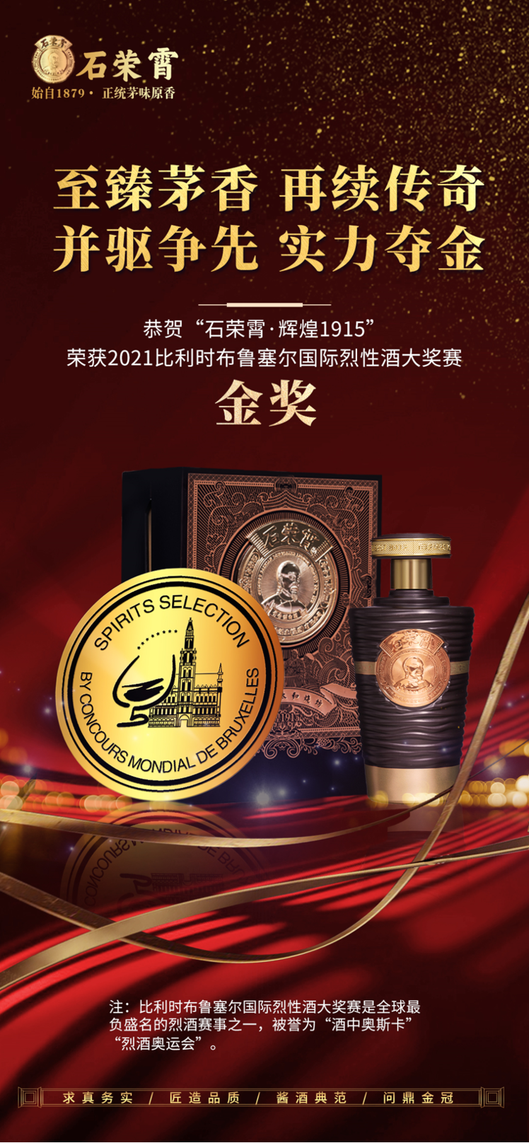 2021年11月3日,“石荣霄·辉煌1915”经过层层角逐,成功斩获第22届比利时布鲁塞尔国际烈性酒大赛金奖。比赛结果同时受欧盟和比利时王国政府双重监管认证。