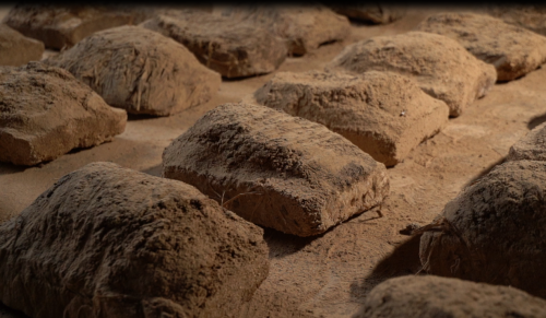 在投料之前,我们需要先了解制曲。茅台镇一直遵循端午制曲、重阳下沙的传统。在端午时节,气温开始升高,是高温制曲的最好时期。曲药以小麦为原料,首先将小麦粉碎,加入水和“母曲”搅拌,放在木盒子里,女人们站在盒子里用脚不停地踩,踩成“曲块”,然后用谷草包起来,进行“装仓”。