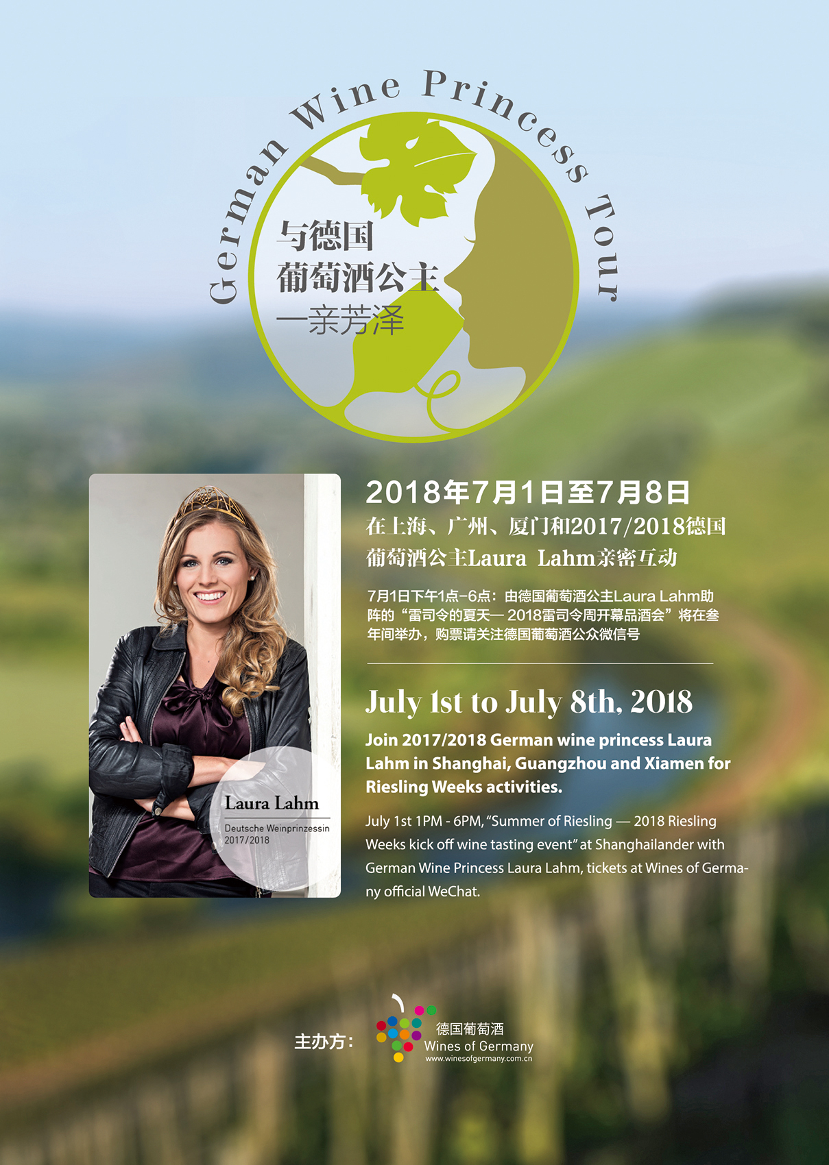 2017/2018德国葡萄酒公主Laura Lahm将在7月1日到7月8日期间来到中国,进行为期一周的德国雷司令周宣传推广活动。届时,她将携同上海、厦门、广州等多家德国葡萄酒进口商和葡萄酒专业机构举办主持一系列德国葡萄酒活动,消费者将近距离感受德国葡萄酒公主的独特气质,领略德国葡萄酒的卓越口感与万千风貌。 7月1日下午1点到6点,由德国葡萄酒公主Laura Lahm助阵的“雷司令的夏天——2018雷司令周开幕品酒会”将在上海叁年间举办,上百名消费者与葡萄酒业内人士将共聚一堂,品鉴50余款德国葡萄酒。