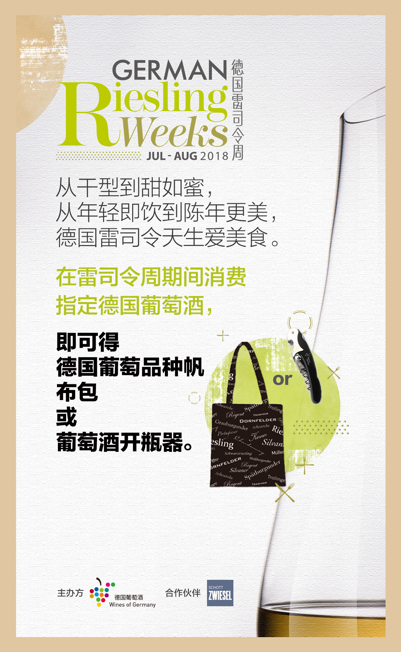 德国十三大产区的雷司令葡萄酒风格万千,从干型至甜如蜜,从新鲜即饮到陈年更美,是搭配众多中西方料理的“多面手”与“佐餐伴侣”。今年的7月和8月,全国17个城市的60余家餐厅将推出包含德国雷司令葡萄酒的餐饮推广,消费者到合作餐厅消费指定德国雷司令葡萄酒或套餐,即可获得德国葡萄品种帆布包或开瓶器。另还消费者可通过参与二维码上的互动游戏,赢取由德国进口水晶酒具品牌SCHOTT ZWIESEL赞助的丰富奖品。全部餐厅名单可登陆2018“德国雷司令周”活动网站全面了解。