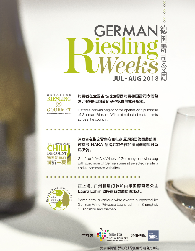 今年夏天,德国葡萄酒协会中国代表处将联合全国各地餐厅、葡萄酒零售及电商和德国葡萄酒进口商倾力打造三大精彩主题活动,分别是“德国雷司令天生爱美食”餐饮渠道推广,“德国葡萄酒清折一夏”零售和电商渠道促销,“2018德国葡萄酒公主巡礼”一系列由2017/2018德国葡萄酒公主Laura Lahm出席的消费者活动,旨在进一步提高德国雷司令及德国葡萄酒在中国内地的知名度。关于2018德国雷司令周的所有信息,即日起登陆2018“德国雷司令周”活动网站即可全面了解。