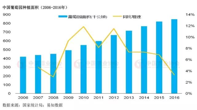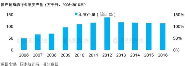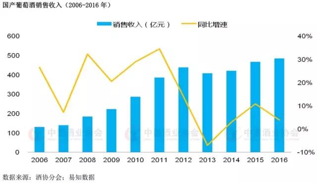 2006至2016年国家统计局数据显示,国产葡萄酒行业销售收入同比增速在2011年创近十年新高,同比2010年上升了34.5个百分点。但从2013年国产葡萄酒销售收入同比增速开始急剧下滑,直至出现负增长现象,2013年经济低迷。而2015和2016两年的情况来看,整个行业还处于底部徘徊阶段。